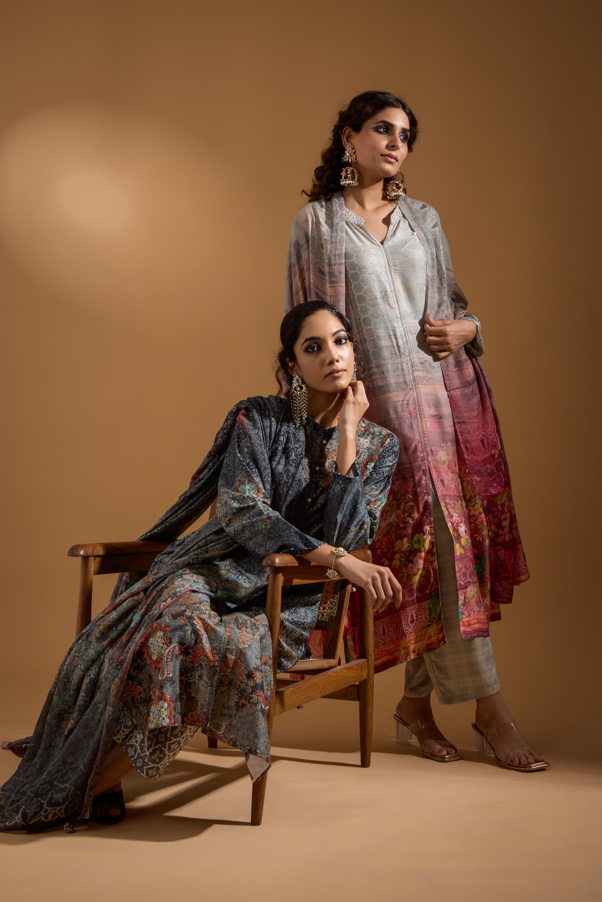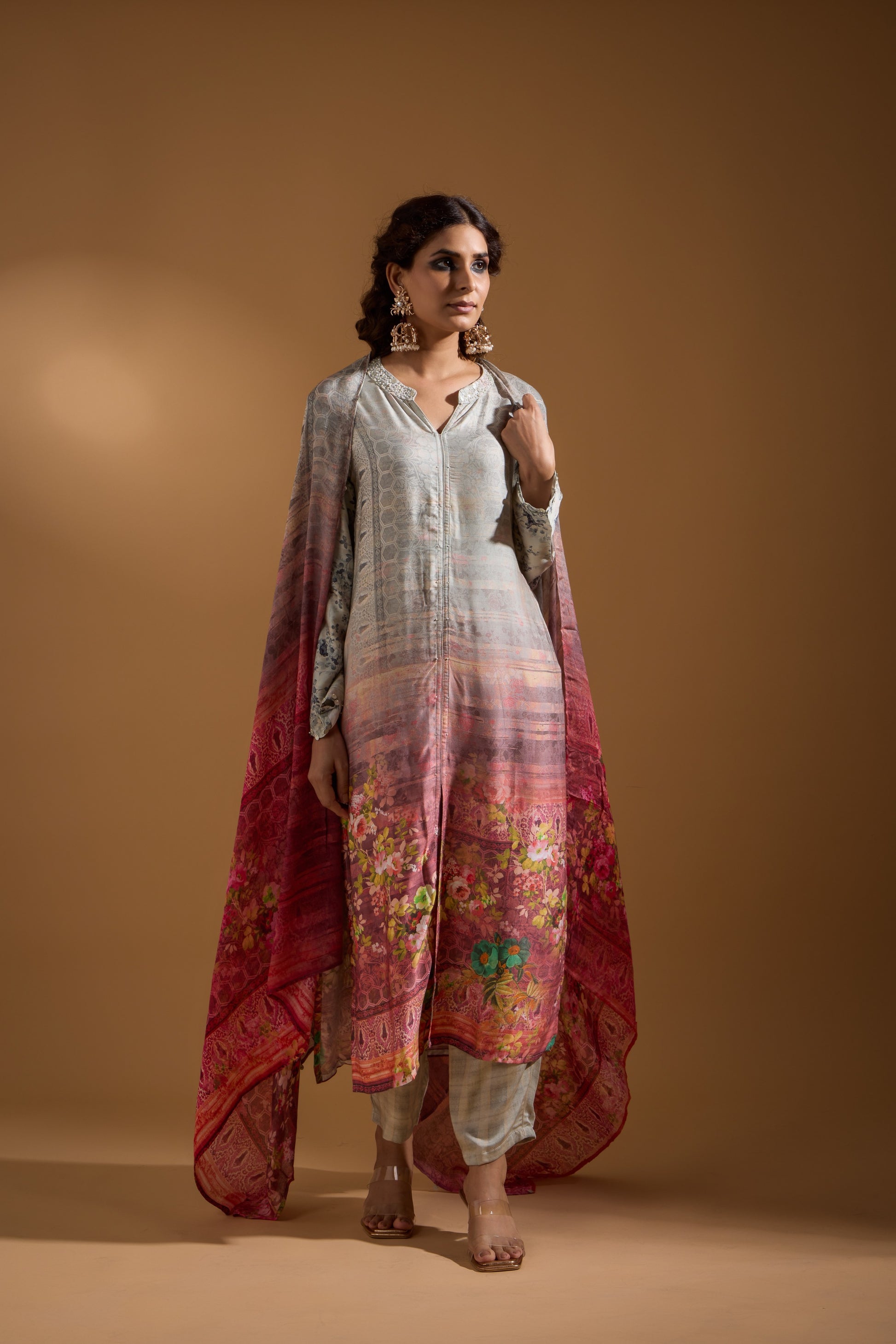 Discover elegance in our printed Pakistani-inspired 3-piece suit. It includes a breathable full-sleeve kurta with hand detailing on the collar and sleeves, printed pants with two pockets and an elastic waistband, and a matching printed dupatta with hand detailing. This set effortlessly blends classic sophistication with modern flair.