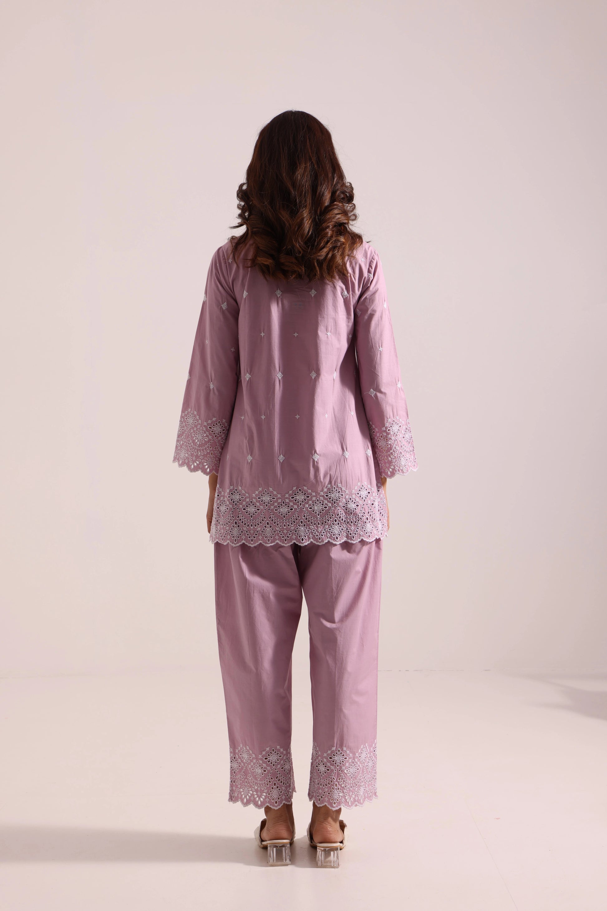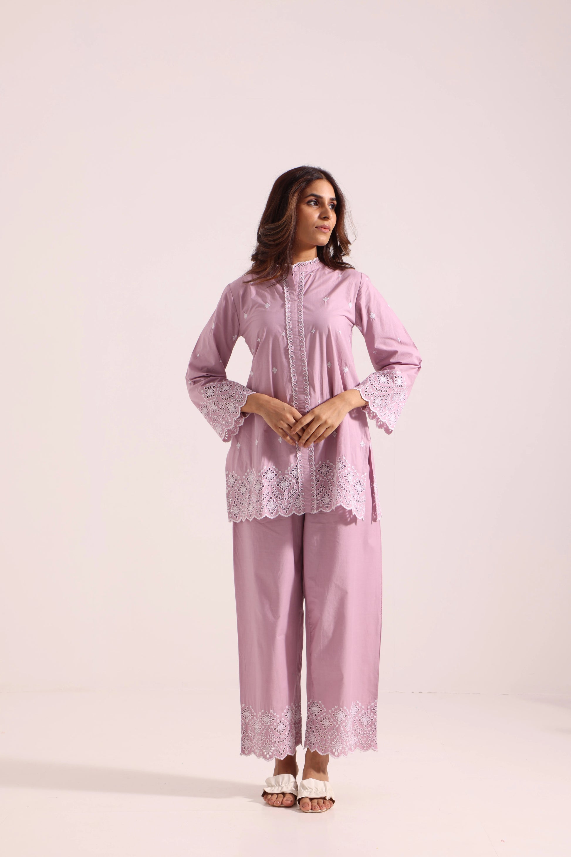 Step into effortless style with our beautifully crafted co-ord set. The top features delicate Schiffli embroidery that brings a touch of charm to the ensemble, while the relaxed-fit pants offer comfort and ease. Designed with two practical pockets, the pants are perfect for on-the-go convenience. This set strikes the perfect balance between casual and refined, making it a versatile choice for everything from daytime outings to evening gatherings.