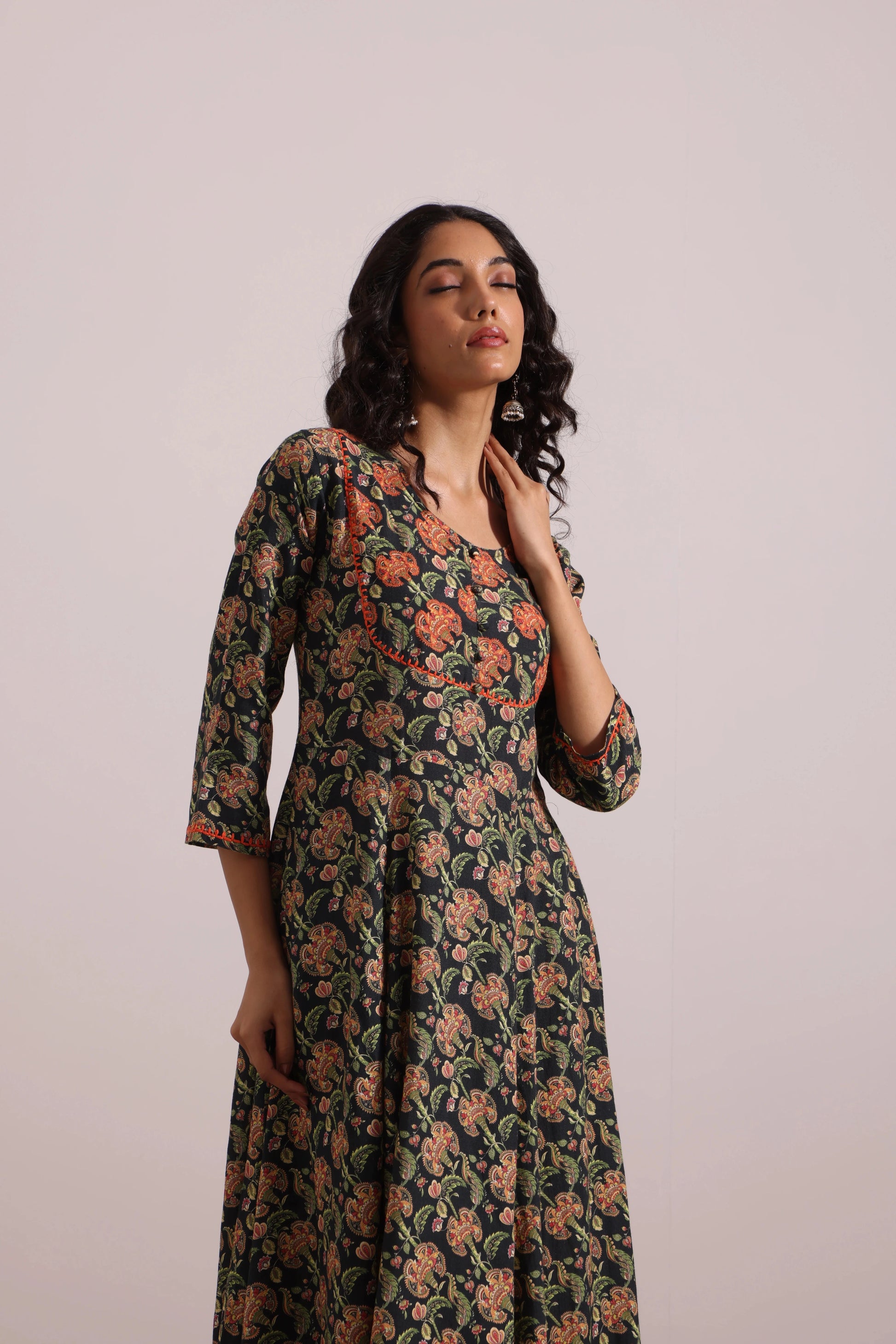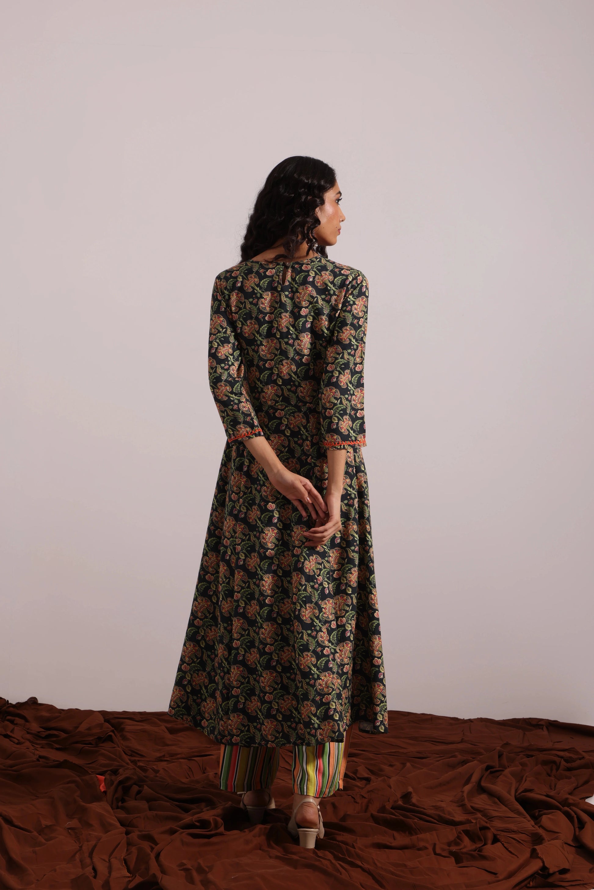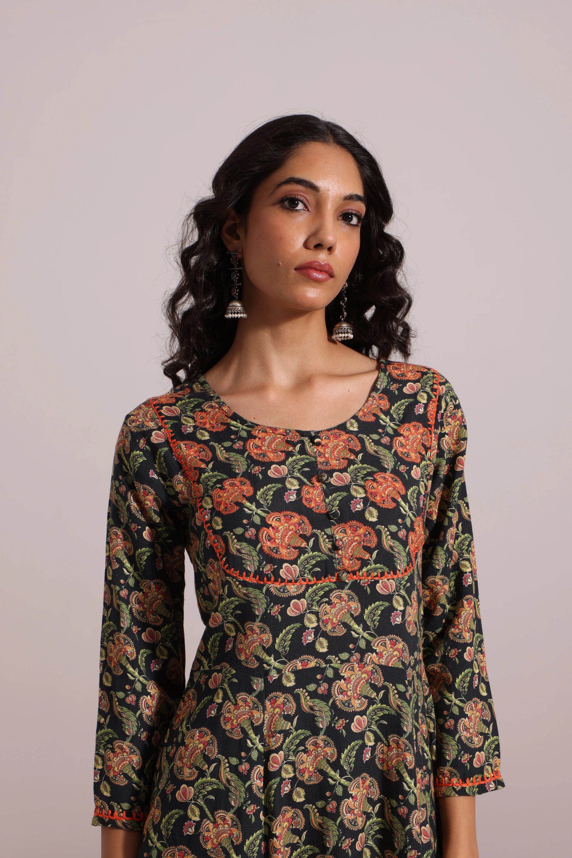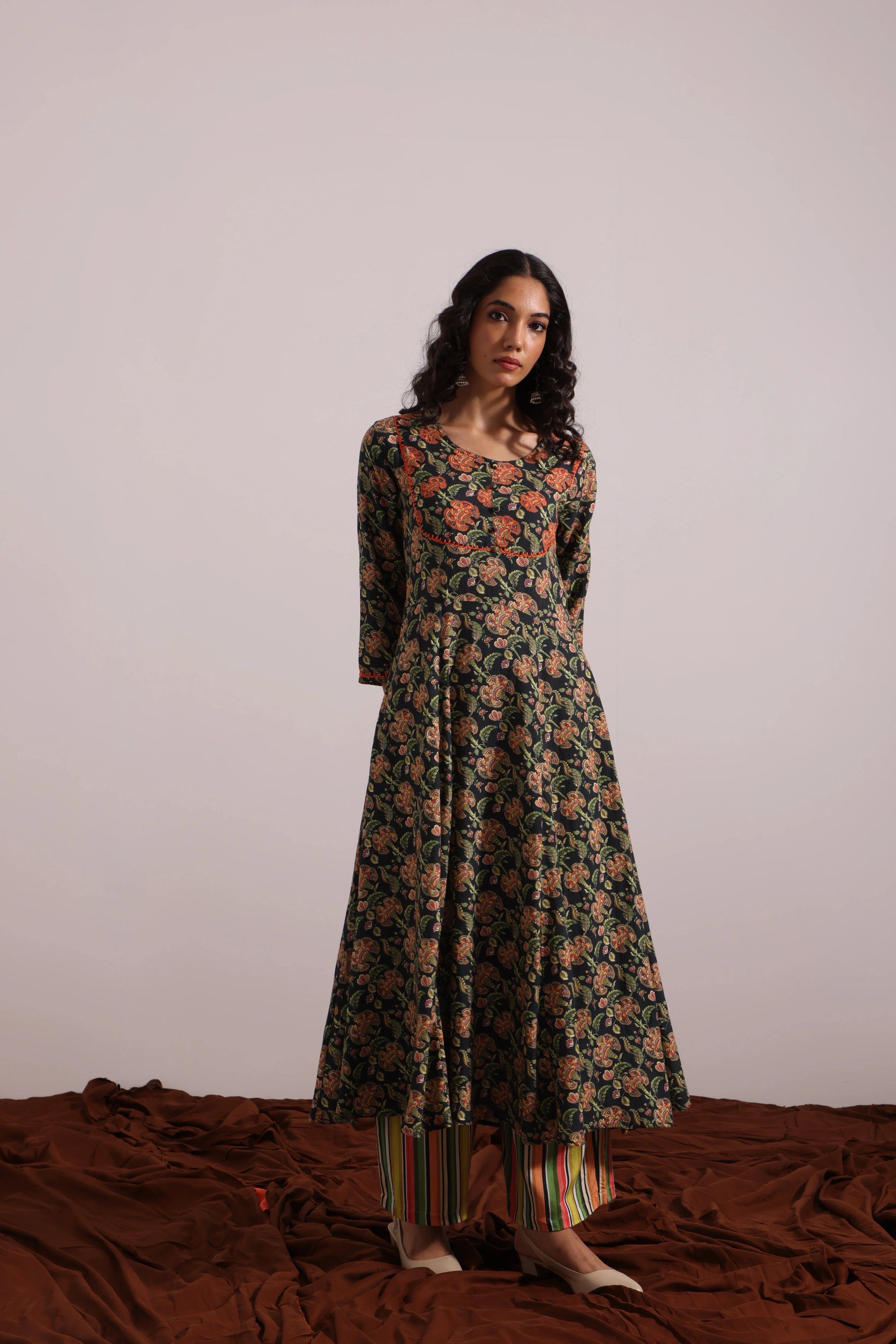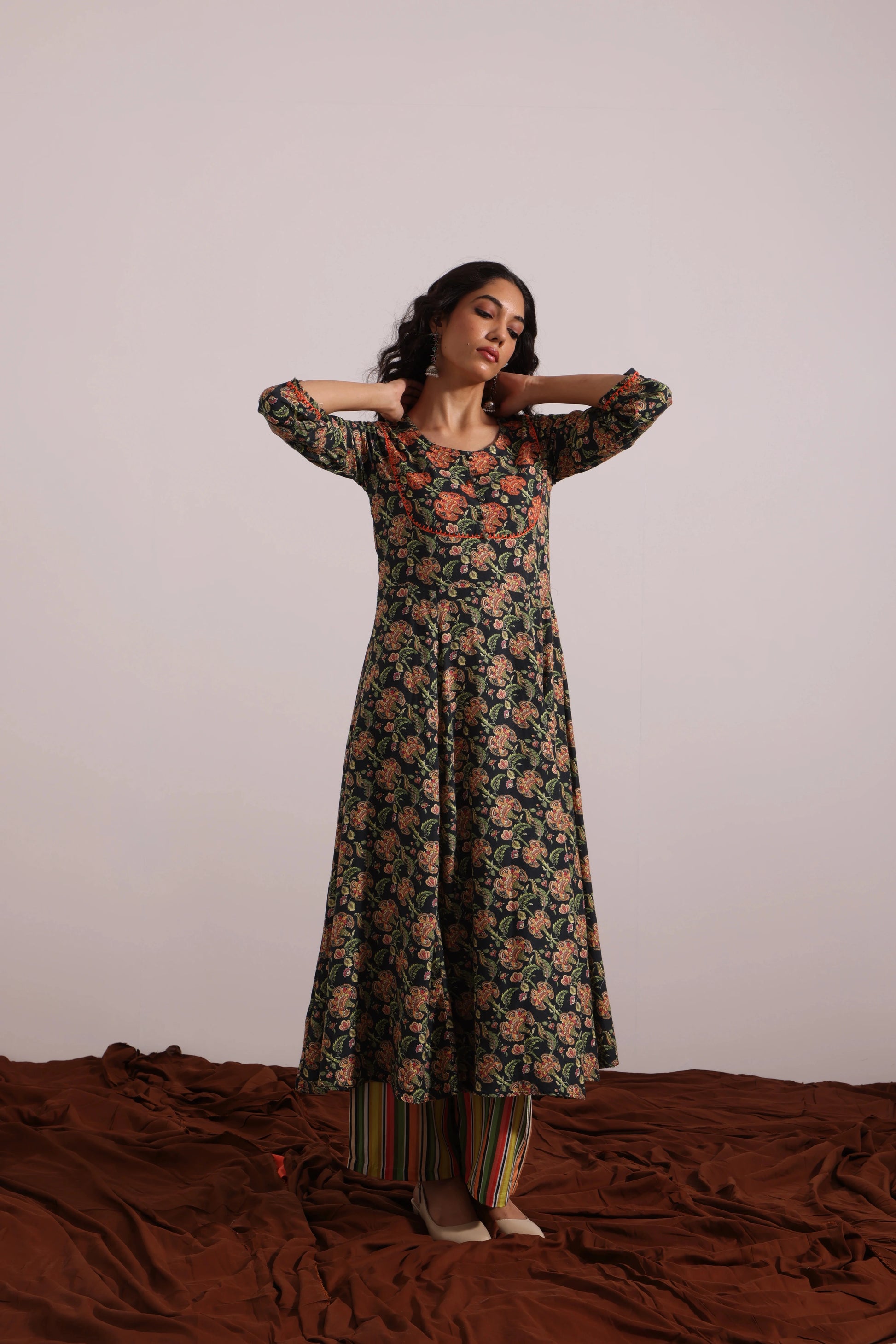 Introducing our modern Anarkali, featuring a charming floral print and exquisite embroidery on the yoke that highlights its elegance. The Anarkali is complemented by wide pants with two pockets for practicality and style. Button detailing on the neckline adds a refined touch, while the effortless flair of the ensemble makes it perfect for any occasion.