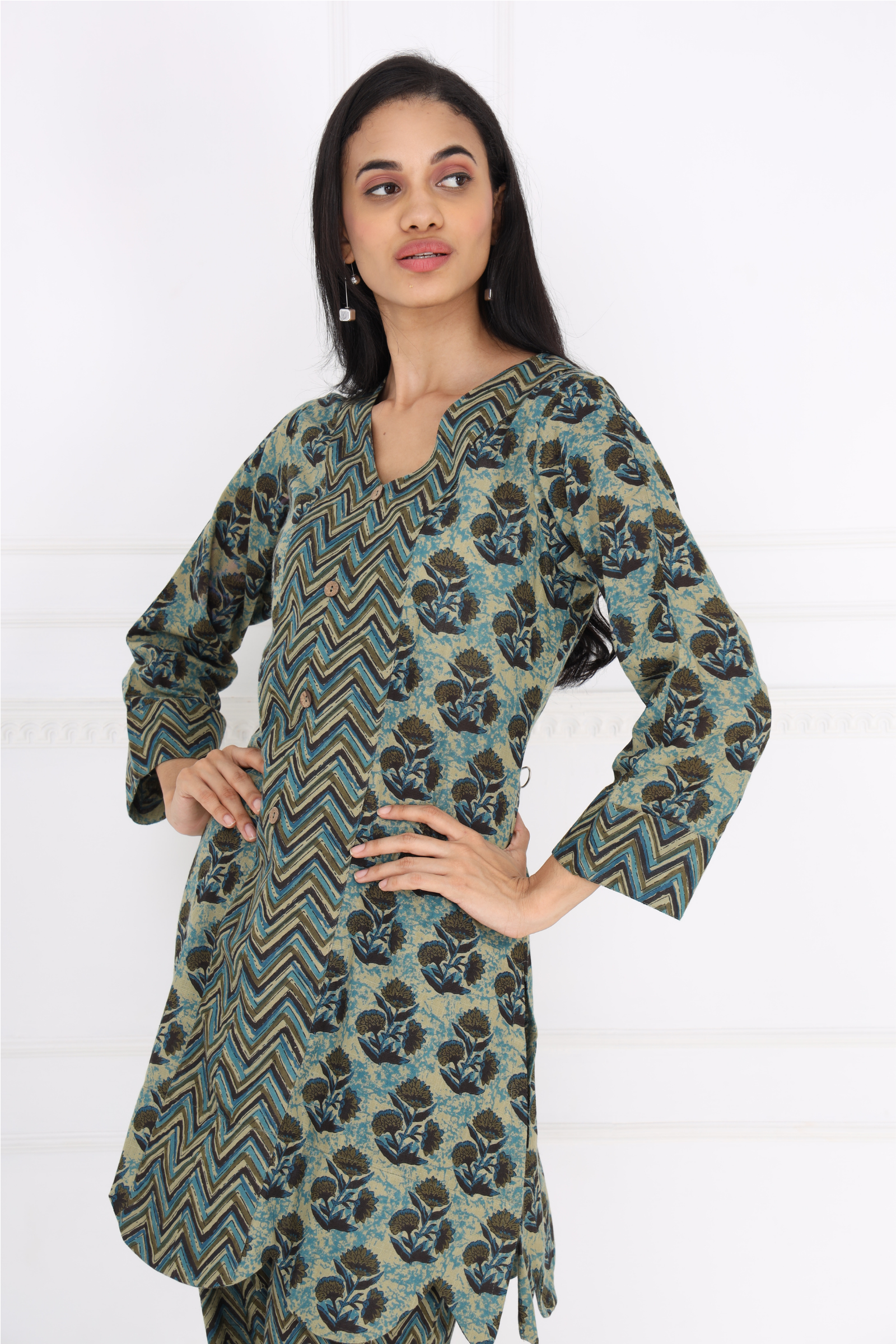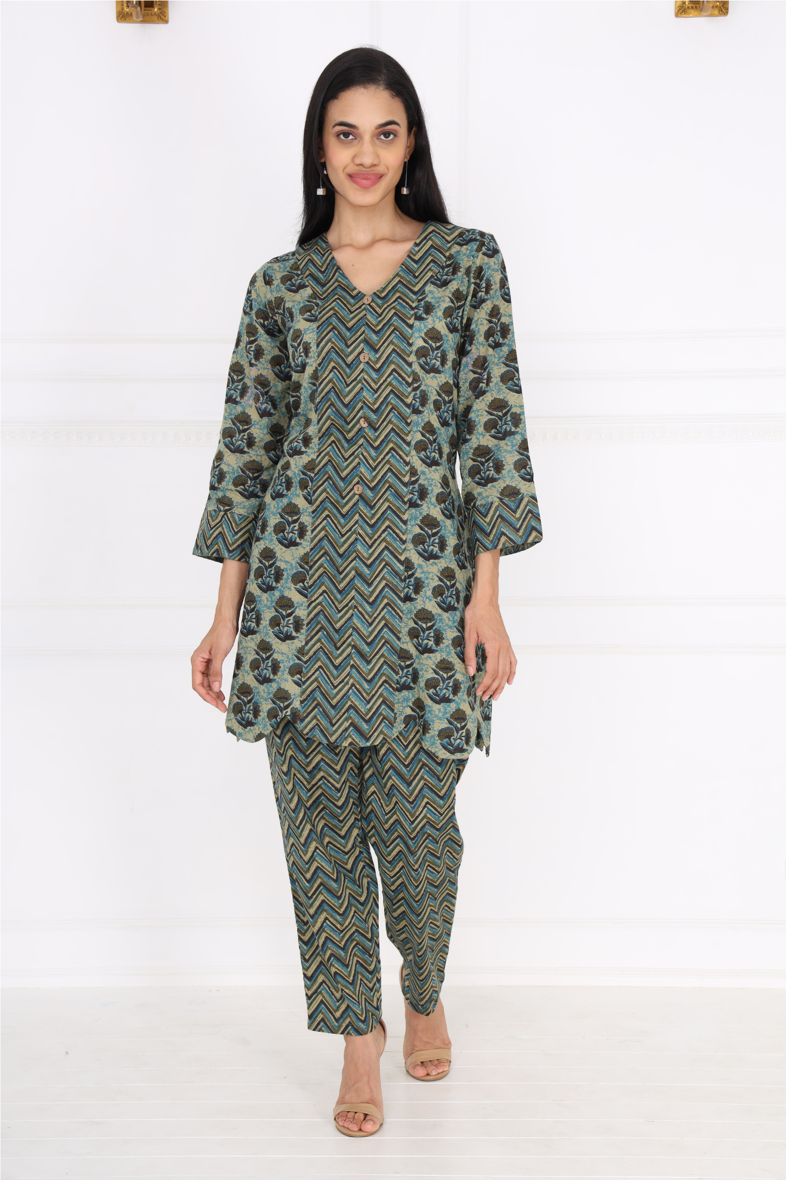 This co-ord set include kurta with pants. Rayon kurta with all over prints, 3/4th sleeves, V - neckline and scallop detailing. Rayon pants with all over prints and elasticated waist with two pockets.